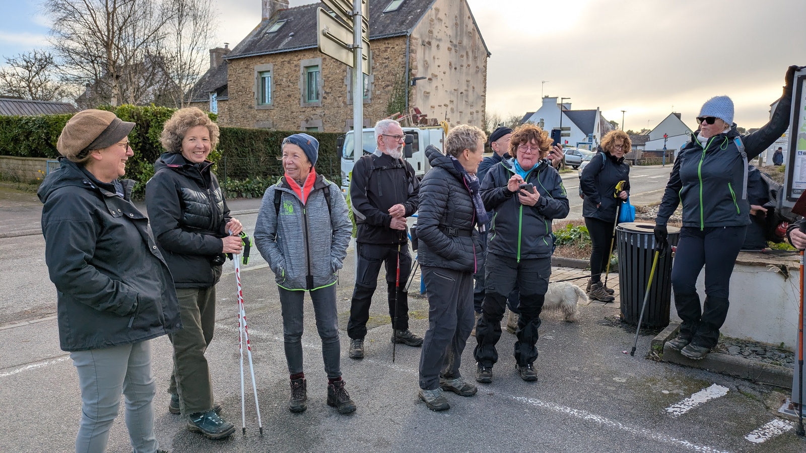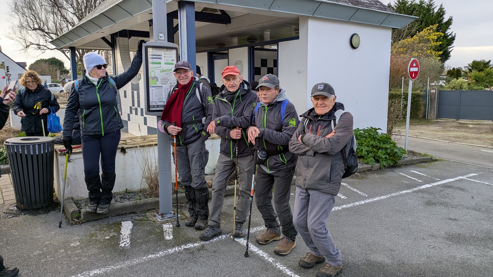 En cette journée relativement clémente, c'est-à-dire sans pluie, quelques amis randonneurs envisagent de terminer leur randonnée en prenant le bus.
